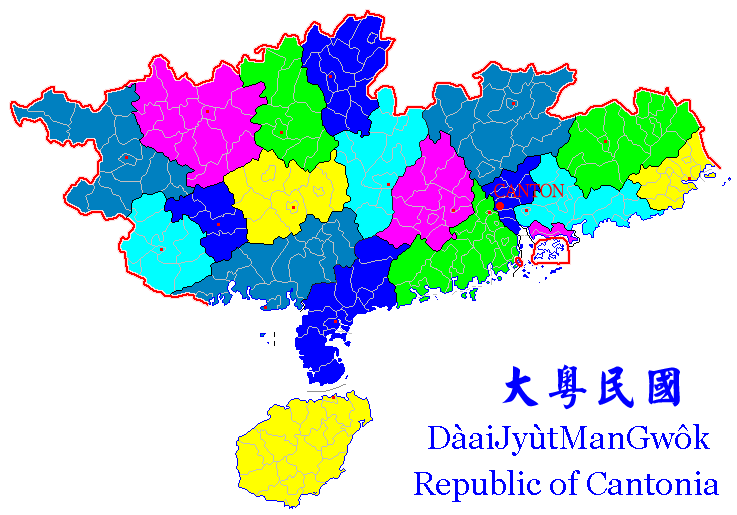 大粵民國(康頓尼亞)/ Republic of Cantonia 本土疆域包括:現時廣東全境、廣西全境、海南全境、雲南東南部、福建西南小部、江西極南小部、湖南極南小部、貴州極南小部、越南極北小部、東沙群島、西沙群島、中沙群島、南沙群島。